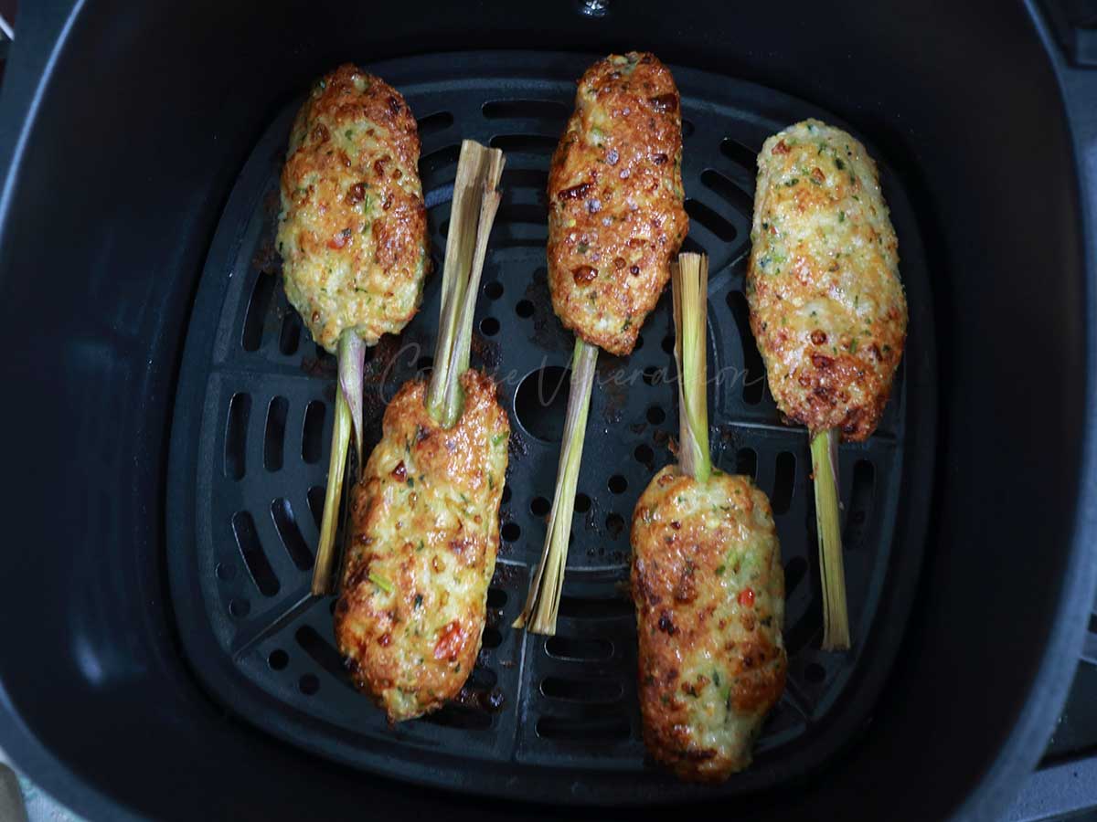 - Arrange the shrimp lemongrass skewers on the rack in a single layer at least an inch apart then spray or brush the tops with oil.