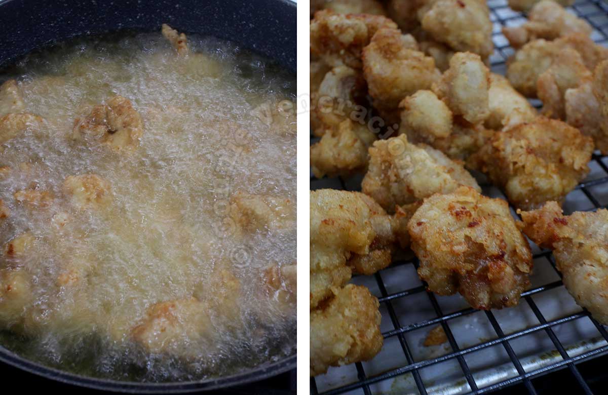 - Fry the chicken cubes a second time, in batches, for another two minutes.