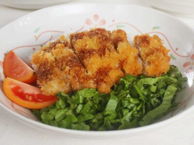 Boneless chicken thighs? Yes, not breast meat. It’s the preferred cut for chicken katsu in Japan. It’s our preferred cut here at home. Unless there’s nothing in the freezer but breast fillets, we always cook our katsu with skin-on thigh fillets. More moist. More tasty.