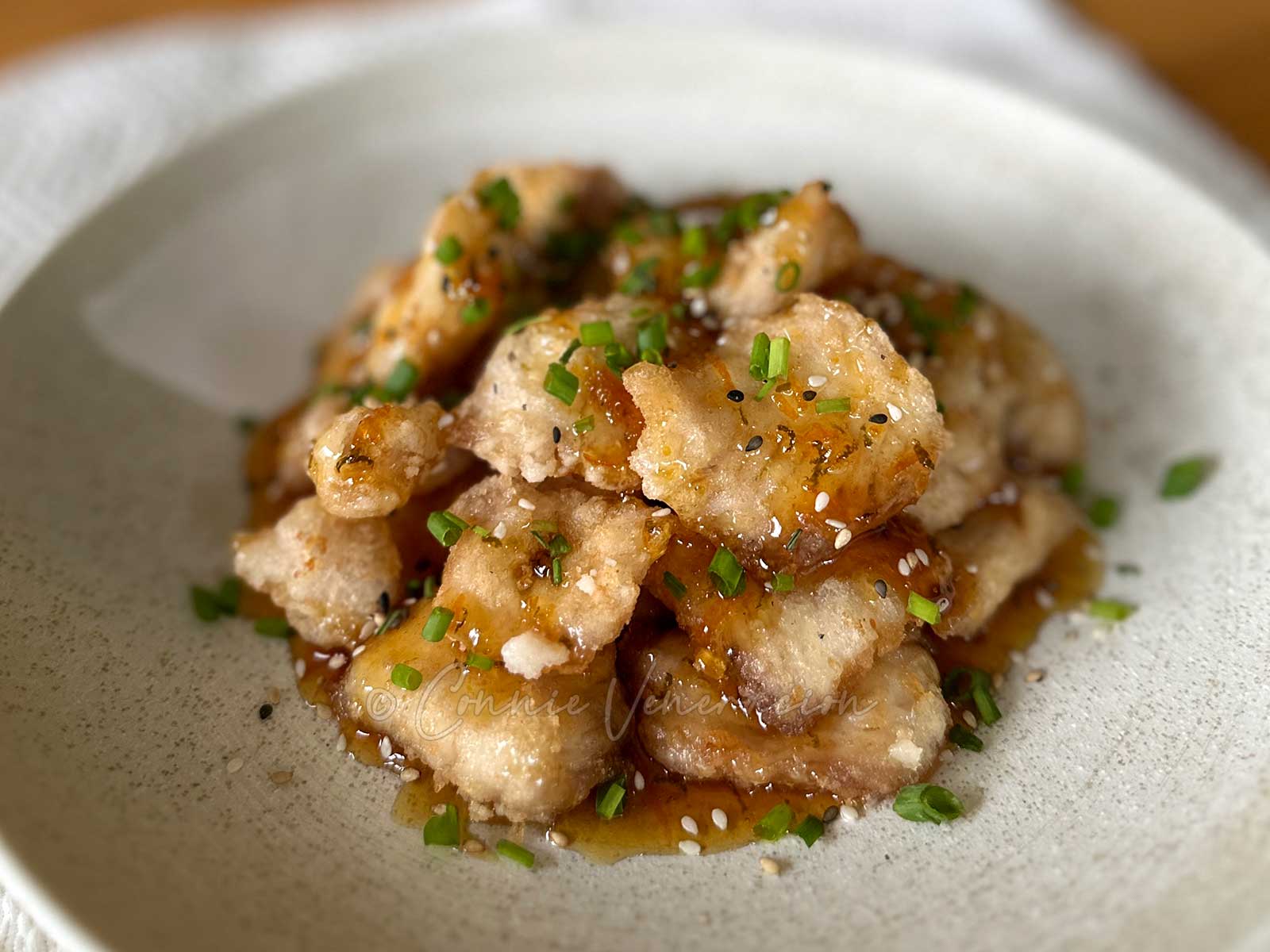 Do not wait for the starch to turn brown during frying because you do not want to overcook the fish. Just fry until a crisp crust forms even if the crust appears pale. The fish will get its reddish-gold color when combined with the sauce off the heat.