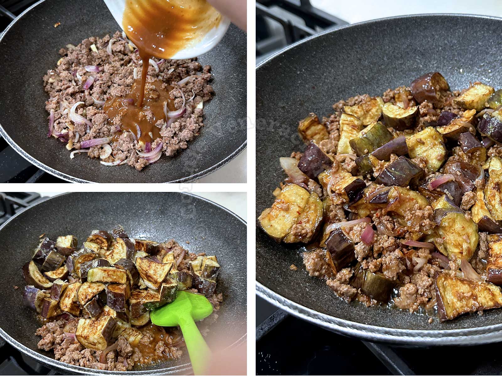 - Pour the sauce over the pork, add the fried eggplants and stir fry just until the eggplants are heated through.